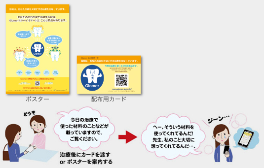 MiCDで使用される材料の中心であるGiomer製品をお使いの方には、患者さま向けGiomerサイトの活用(歯科医院一覧に掲載!)やポスター、配布用カードなどを無料で配布しています。